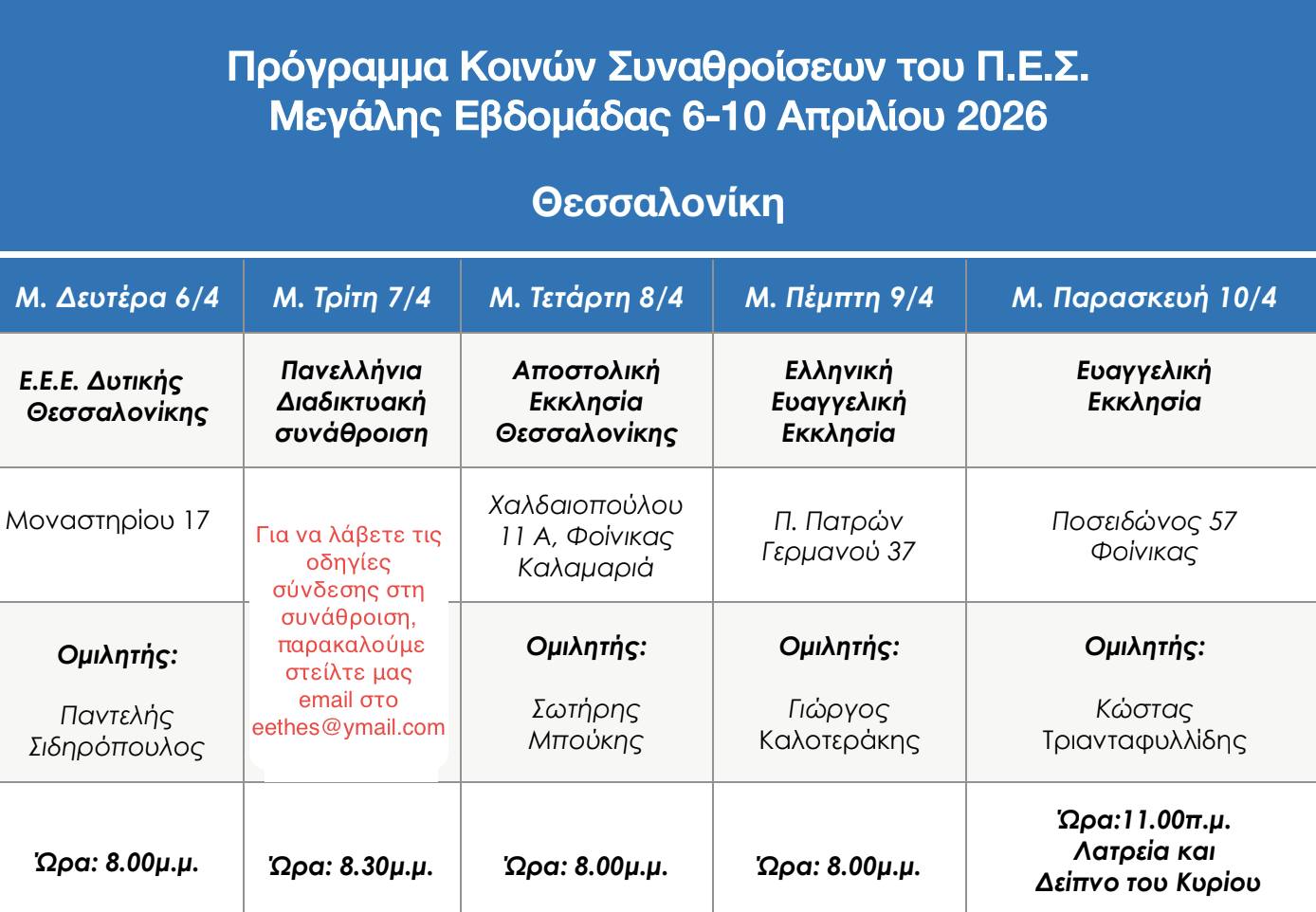 Για να συμμετέχετε στην ώρα της συμπροσευχής, παρακαλούμε να μας στείλετε email στο eethes@ymail.com, με θέμα "Συμμετοχή στην ώρα συμπροσευχής" και θα σας απαντήσουμε σύντομα με τις σχετικές οδηγίες.